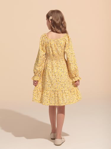 Haloumoning Girls Dresses Kids Floral Long Lantern Sleeve Square Neck Smocked Flowy Dress 5-14 Years 6