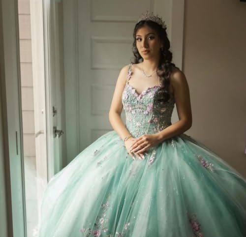 • Kncpti Spaghetti Straps Quinceanera Dresses Ball Gowns 3D Lace Appliques Sweet 16 Dresses for Teens Long Prom Formal Evening Party Gowns