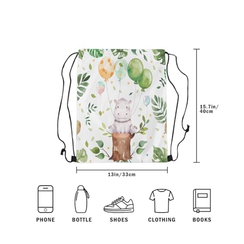 Erosebridal Cute Hippo Drawstring Backpack 13x15.7, Kawaii Animals Balloons Drawstring Bags For Sport, Cartoon Leaves Foldable Draw String Back Bag, Green White Wildlife Printed String Backpack 6