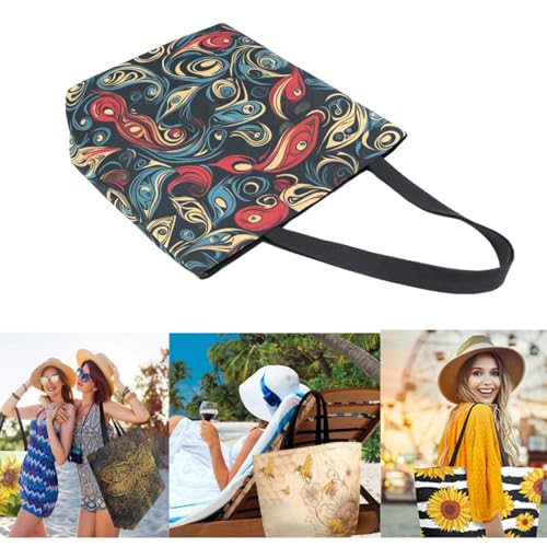 Ethnic Blue Red Decorative Fish Extra Large Canvas Gym Shoulder Tote,Durable Daily Reusable Top Handle Bag for Mens Womens Yoga Weekender Picnic Beach Travel Market Shopping 6
