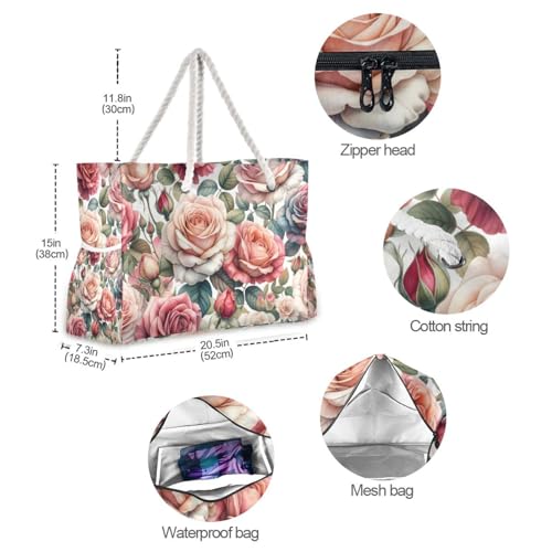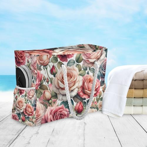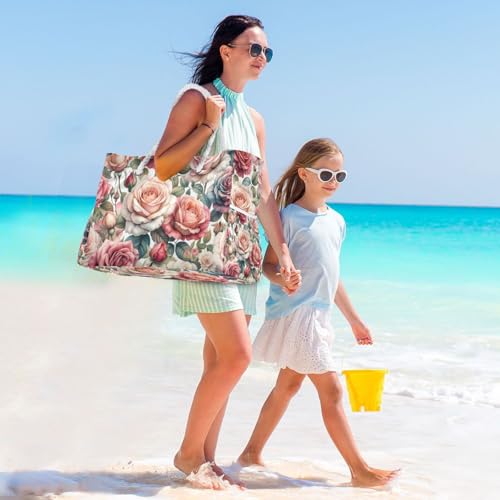 OTVEE Watercolor Rose Pattern Beach Bags for Women Ladies Large Canvas Tote Shoulder Bag Waterproof Travel Bags for Gym Swim Pool Camping 4