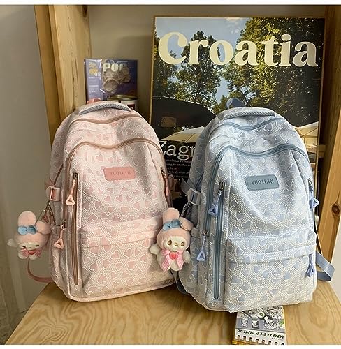 HOT ! JHTPSLR Preppy Backpack with Plushies Cute Love Hearts Aesthetic Backpack Double Zipper Large Book Bags Waterproof Laptop Backpack (Blue)