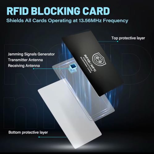 • Simply place the RFID blocking card in your wallet, and it will automatically block unauthorized scanning without any need for batteries or charging.