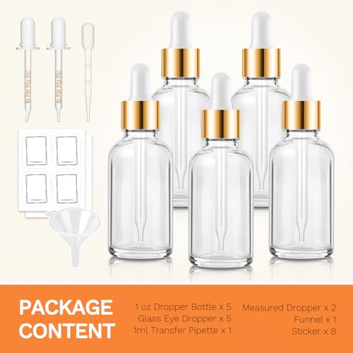 • What You Get: 5-pack 1 oz glass dropper bottles, 2 extra measured dropper (1ml), 1 funnel, 1 transfer pipette (1ml), 8 Stickers