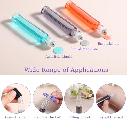 • Premium Quality: Crafted from durable clear glass, these roller ball applicator for essential oils 10ml feature stainless steel roller balls and black plastic caps for leak-proof protection. The smooth roller ball ensures even application and gentle massage, enhancing your aromatherapy experience with precision and ease.