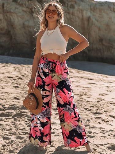 NIMIN Women Wide Leg Palazzo Pants High Waisted Casual Flowy Lounge Pants Floral Solid Beach Trousers with Pockets 4
