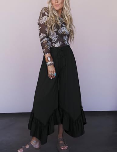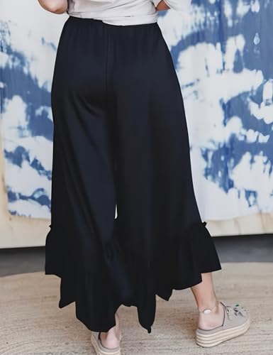 • Features: The flowy womens wide leg pants with continuous V-shaped ruffle edge at the hem, and adjustable drawstring elastic design at the waist, allowing you to freely stretch the waist, two functional side pockets, relaxed fit, solid color