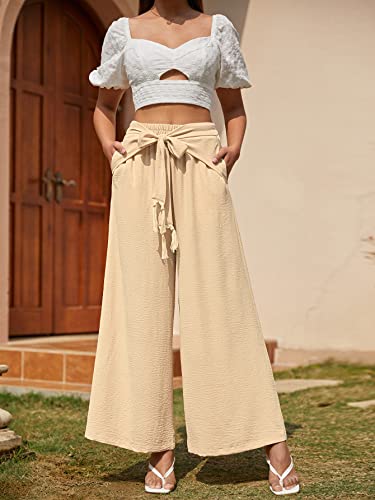 HOT ! Miessial Women's Summer Tie Front Wide Leg Pants Elastic Waist Casual Pants Beach Palazzo Pants with Fringe Lace up Ivory