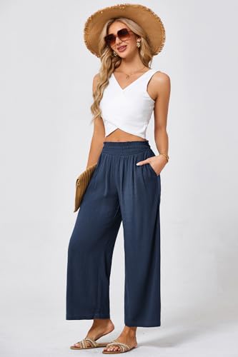 JASAMBAC Women's Capri Linen Wide Leg Pants Summer Boho Wide Leg Pants Smocked High-Rise Waist Casual Beach Pants with Pocket 6