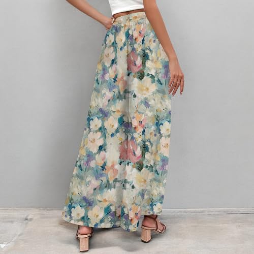 HOT ! Floral Wide Leg Pants Women Elastic Waist Summer Beach Pant Side Slit Flowy Boho Trouser Tropical Lounge Baggy Jogger