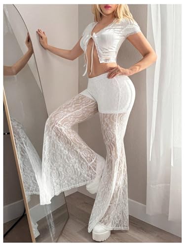 • Features: Coquette flared pants for women, sheer mesh, lace, ruffle hem, see through, elastic waist
