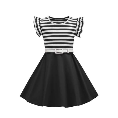 Girls Casual Vintage Ruffle Short Sleeve Striped Patchwork Dresses with Belt Party Holiday Evening Dress for Kids 6