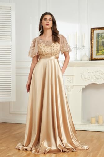• Features: A-Line, empire waist, short flutter sleeves, glitter embroidery upper half, floor length satin prom dress, make this evening dress a classic choice.