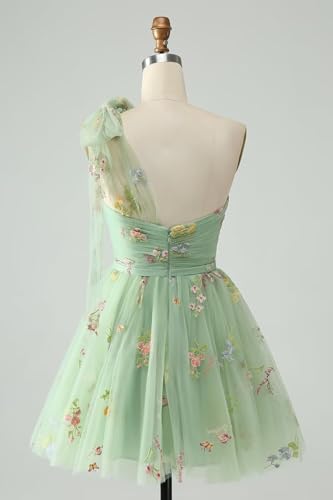 • Feathers: Short Homecoming Dresses, Flower Embroidery Tulle, One Shoulder with Bow knots, Elegant Hem, Sweetheart Neckline, A-Line, Knee Length, Built-In Bra, Full Lined, High waist, Backless/Open Back, String Lace up, with inseam pockets, Ruched Bodice.Perfect as mini prom dress.