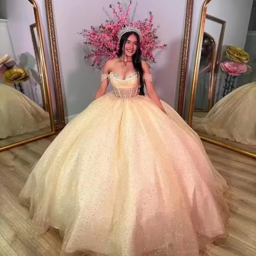 HOT ! WDBFY Glitter Tulle Quinceanera Dresses with Bow Off Shoulder Beaded Sweet 16 Desses Puffy Tulle Pleated Long Ball Gowns