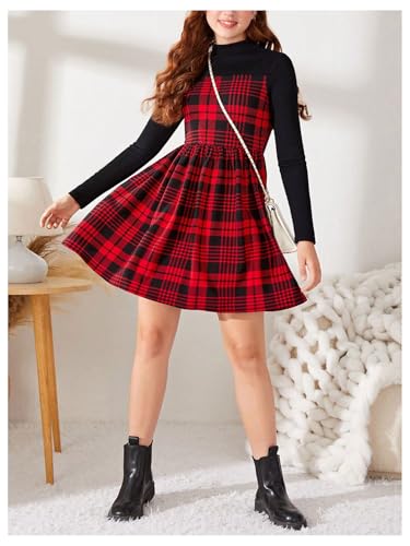 SweatyRocks Girl's Tartan Plaid Dress Long Sleeve High Waisted A Line Flared Short Dresses 6