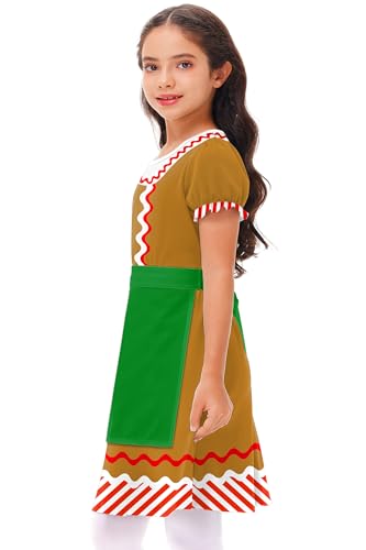 Xmas Puff Sleeve Dress Christmas Gingerbread Girl Dress with Apron Elastic Waist Aline Dresses 5-6 Years 7