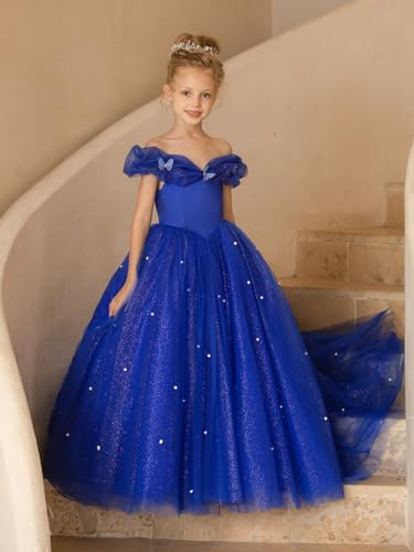 • 🎀FEATURES:Elegant off the shoulder puffy tulle flower girl dresses for wedding with bow and pearls,floor lenth a-line tulle first communion formal dress for toddler girls kids.HEWEGO provide popular colors and US 2 -US 14 sizes for your little princess. Long high wasit formal pageant dress make you kids more elegant and noble at any special moment. You princess will receive many compliments on this beautiful dress!