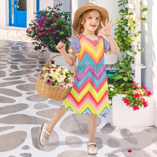 Toddler Girls Dress Rainbow Chevron Short Sleeve Summer Dress Soft Comfort Kids Casual Sundress, 2T 7