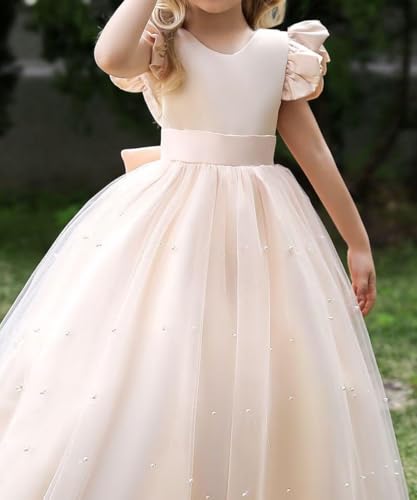 • Features: Satin and tulle flower girl dress features round neckline, flyaway sleeves, embellished pearls at the hemline, zipper closure, a cute satin fabric detachable bow. This flower girl maxi dress makes your kids look more elegant and lovely for any special occasion, making your little fairy look so distinctive.
