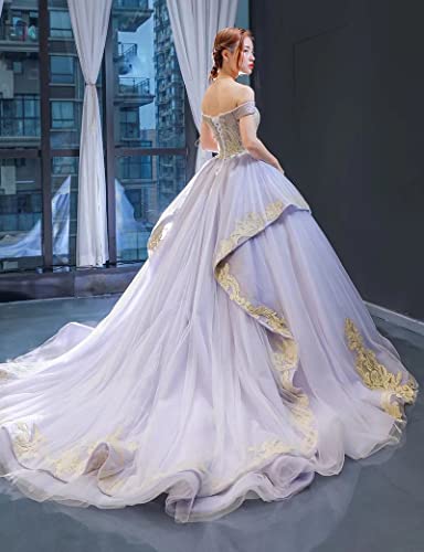• Gold Lace Wedding Dresses For Women,Court Train Wedding Dress Lavender,Off Shoulder Bridal Dresses Plus Size