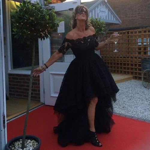 ZVOCY Lace Prom Dress Black Short Sleeve Hi Lo Evening Dress Off The Shoulder Formal Gown 6