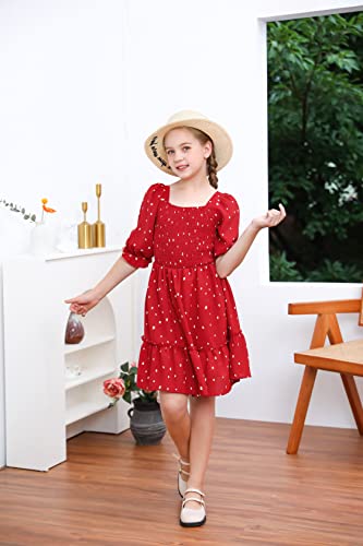 HOT ! Girls Dress Sweet & Cute Puff Sleeve Square Neck Ruffle Whimsy Polka Dot Ruffle Swing Dress 5-14(9-10 Years)