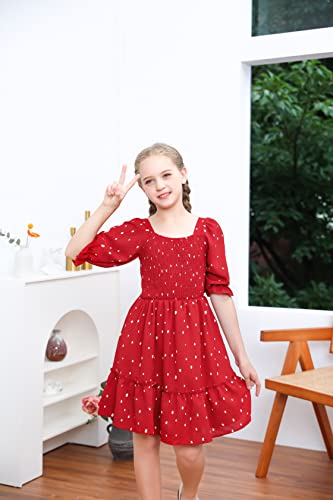 Girls Dress Sweet & Cute Puff Sleeve Square Neck Ruffle Whimsy Polka Dot Ruffle Swing Dress 5-14(9-10 Years) 5