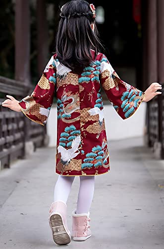 Girl's Long Bell Sleeve Gilded Chinese Dragon Crane and Pine Tree Dress 5