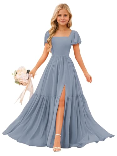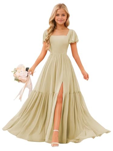 • Features:Flowy Short sleeves Junior Bridesmaid Dress,Pleated Chiffon Flower Girls Dresses for Wedding,Square Neck Girls Bridesmaid Dress,Flutter Sleeves A-line Flower Girl Dress,A line floor length girls wedding dress,elegant square neck empire waist evening gown, paired with short flutter sleeves.Your little princess will be excited about this gorgeous chiffon dress.