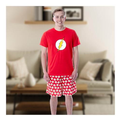 • CLASSIC THE FLASH LIGHTNING BOLT SYMBOL - This 2 pc pajama set features a short sleeve top and shorts. The tee features a large front design of the classic lightning bolt seen on The Flash's suit. The bottoms feature the same lightning bolt logo in an all-over toss print and have an elastic waistband with 2 side pockets. If you are a DC Comics fanatic, then you will love these!