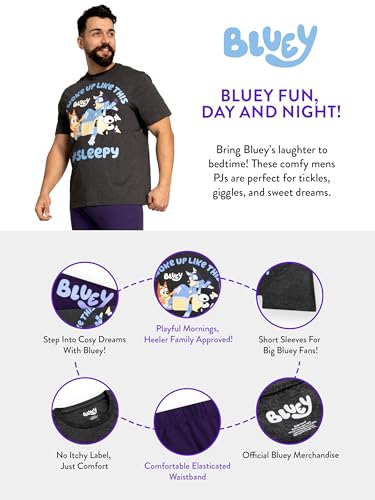 • Fun And Stylish Design For Bluey Fans: Elevate your nightwear with these Bluey adult pajamas a must have addition to any Bluey merch for adults collection. Featuring a grey short sleeve top with a playful print of Bluey, Bingo, and Bandit alongside the cheeky slogan "I WOKE UP LIKE THIS," these pajamas for men perfectly capture that light-hearted dad-and-daughter vibe. The bright blue text and "#SLEEP" hashtag add a splash of fun to your evening routine