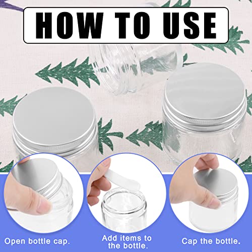 • ♛【High Quality Material】: These glass jars are made of high quality clear glass, stable and high temperature resistance. Silver aluminum lids are not easy to rust. The airtight glass jars' thick glass raised bottom is effectively shockproof, and the screw of the bottle mouth is clear and easy to rotate.
