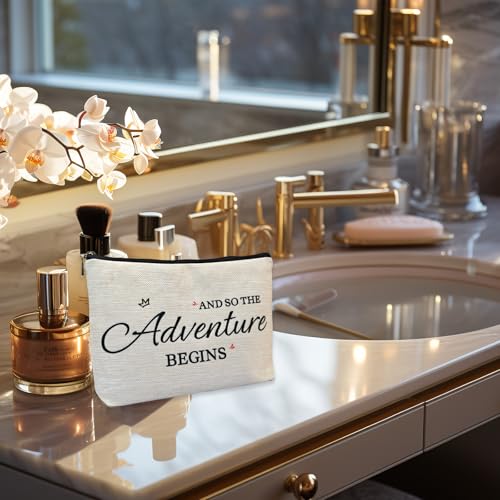 • 【New Beginnings Gifts for Women】: Featuring the exquisite words "And So The Adventure Begins" in an elegant and eye-catching font, this cosmetic bag adds a touch of glamour to any occasion. The classic pattern design makes it a fashionable and chic addition to any bride's collection, whether she's preparing for her engagement party, bachelorette party, or wedding day essentials.