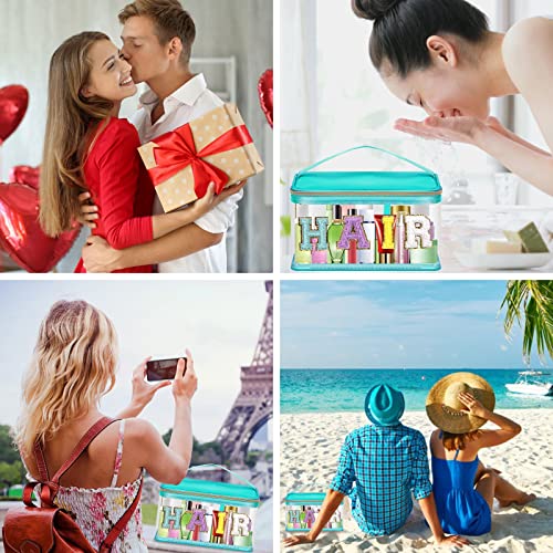 Iqimott Preppy Clear Makeup Cosmetic Bag for Women Travel, Nylon PVC Chenille Glitter Letter Toiletry Storage Tote Bag, Transparent Waterproof Organizer Zipper Pouch with Handle(Hair, Green) 6