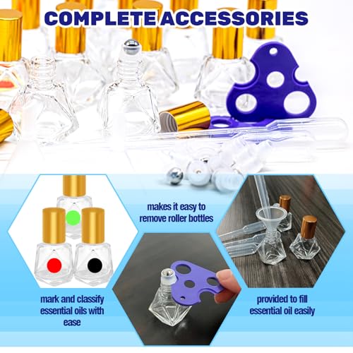 41Pcs 8ml/0.27oz Polygonal Clear Glass Roller Bottles Kit Contains Stainless Steel Empty Refillable Roll on Glass Bottles, Funnels, Blank Labels, Opener, Pipettes for Essential Oil 5