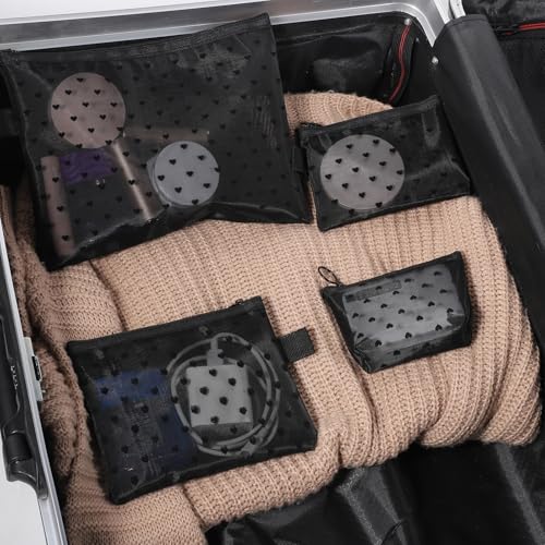 4 PCS Mesh Makeup Bag Set, Heart Printed Mesh Pouches for Purse Portable Travel Cosmetic Bags Small Toiletry Bag with Zipper Black Makeup Pouches for Home Offices Travel Accessories 5