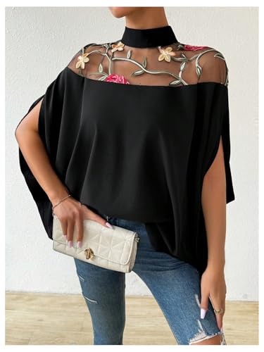 • Features: Sheer mesh, floral embroidery, stand collar, dolman sleeve, loose fit, summer blouses