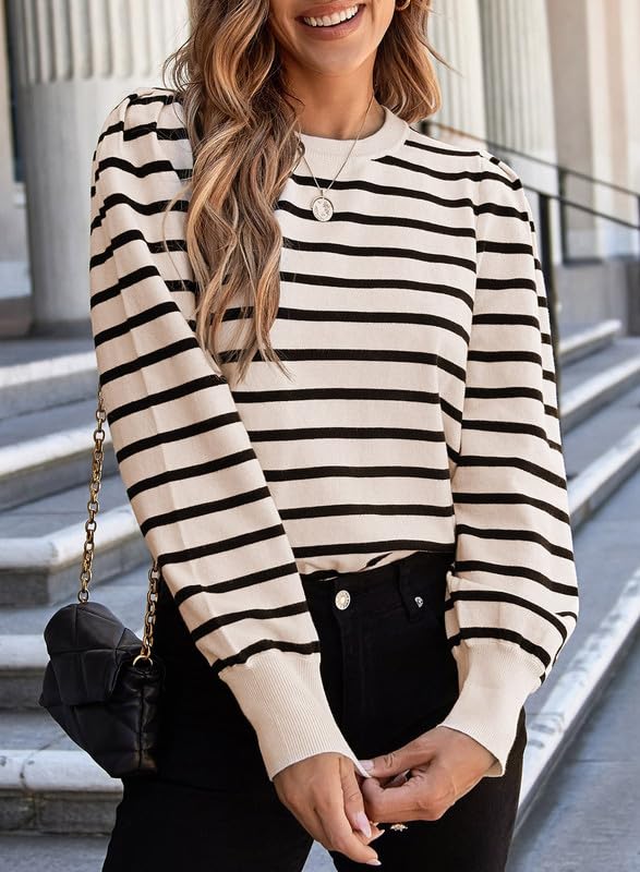 Dokotoo Women's Striped Sweaters Puff Long Sleeve Crewneck Ribbed Knit Pullover Jumper Tops 1