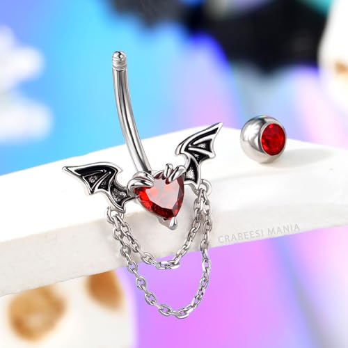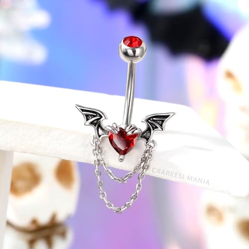 CM Crareesi Mania Halloween Belly Button Ring 316L Stainless Steel Belly Rings Double Chain 14G 10mm Bat Belly Piercing Jewelry Red CZ Navel Rings Heart Navel Piercing 4
