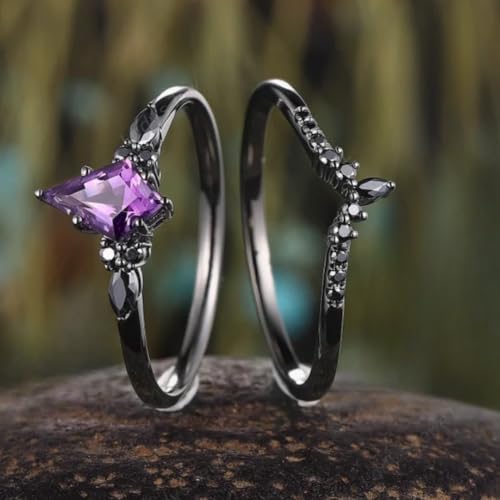 IVANKA Black Gold Kite Cut Amethyst Engagement Ring Set Witchy Rhodium Black Promise Ring Gothic Black Wedding Band Set Anniversary Ring Bridal Set Wedding Ring Set Purple Gemstone February Birthstone Statement Ring Set Amethyst Wedding Set Stackable Ring Gift For Her 2