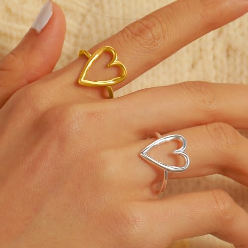 Irregular Hammered Hollow Heart Stackable Ring for Women 925 Sterling Silver Minimalist Stylish LOVE Heart Rings to Daughter Mom 14K Gold Plated Adjustable Open Band Ring Wedding Hallowmas Jewelry 4