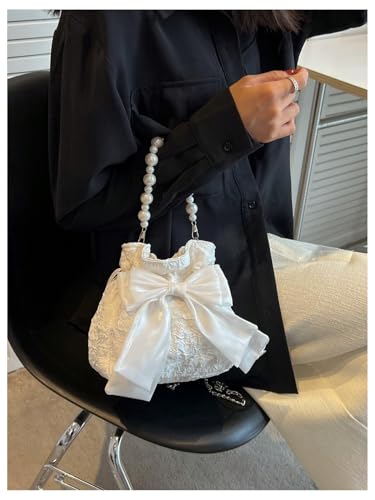 GORGLITTER Women’s Pearls Bow Chain Bucket Bags Textured Coquette Evening Shoulder Handbags 6