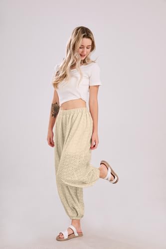 utcoco Womens Eyelet Lace Beach Palazzo Harem Pants Casual Loose Embroidery High Waist Cotton Trousers with Pockets 1