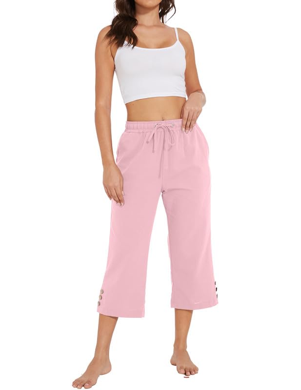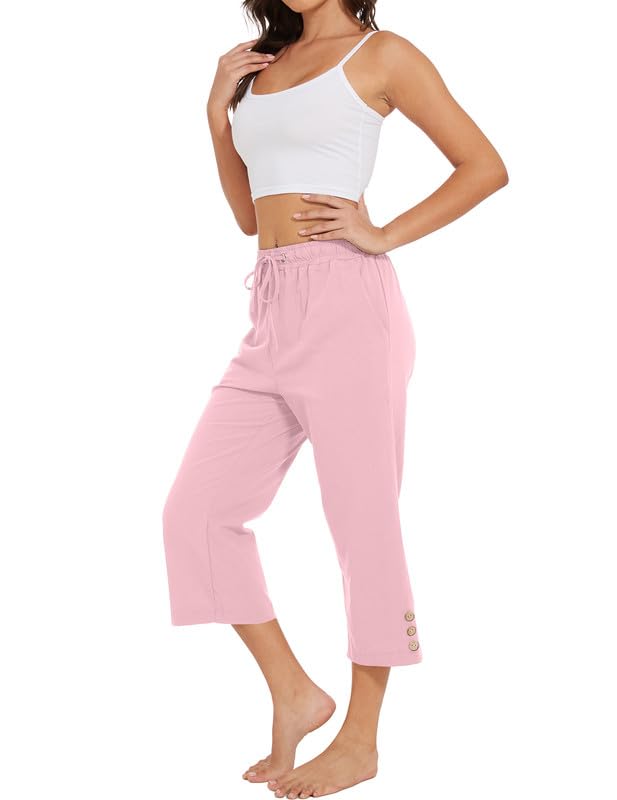Womens Capris Pants High Waist Drawstring Comfy Casual Lightweight Loose Trousers Buttons Trim with Pockets 7