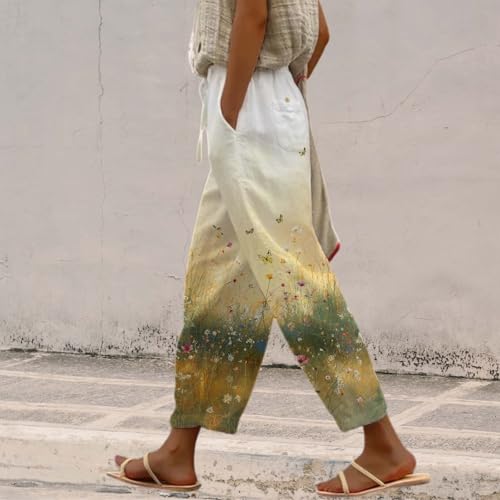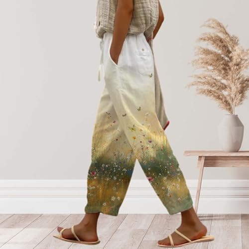 HOT ! Boho Cotton Linen Pants for Womens 2025 Summer Casual Drawstring High Waisted Capri Pants with Pockets