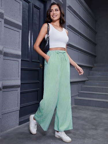 Women's Striped Wide Leg Pants with Pockets High Waist Drawstring Loose Trousers Palazzo Pants Green 4