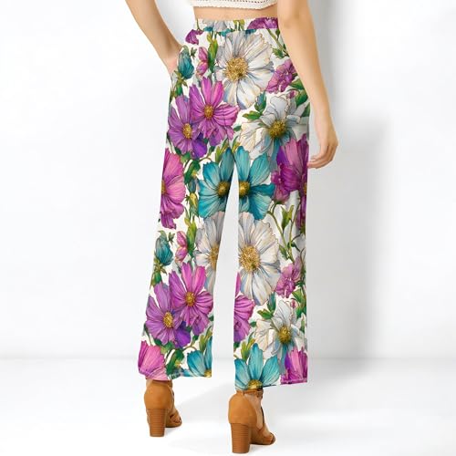 Womens Boho Floral Wide Leg Pants Casual Loose Elastic High Waisted Drawstring Palazzo Pants with Pockets 4
