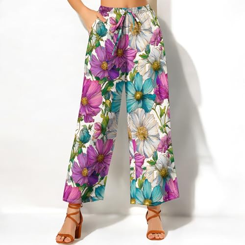 HOT ! Womens Boho Floral Wide Leg Pants Casual Loose Elastic High Waisted Drawstring Palazzo Pants with Pockets