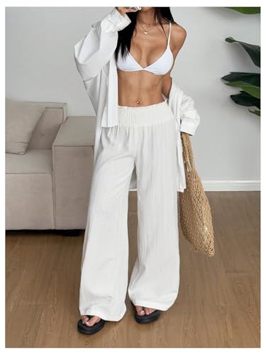 More information about Women's Smocked Wide Leg Lounge Pants Ruffle Trim High Waisted Baggy Palazzo Pants Trousers